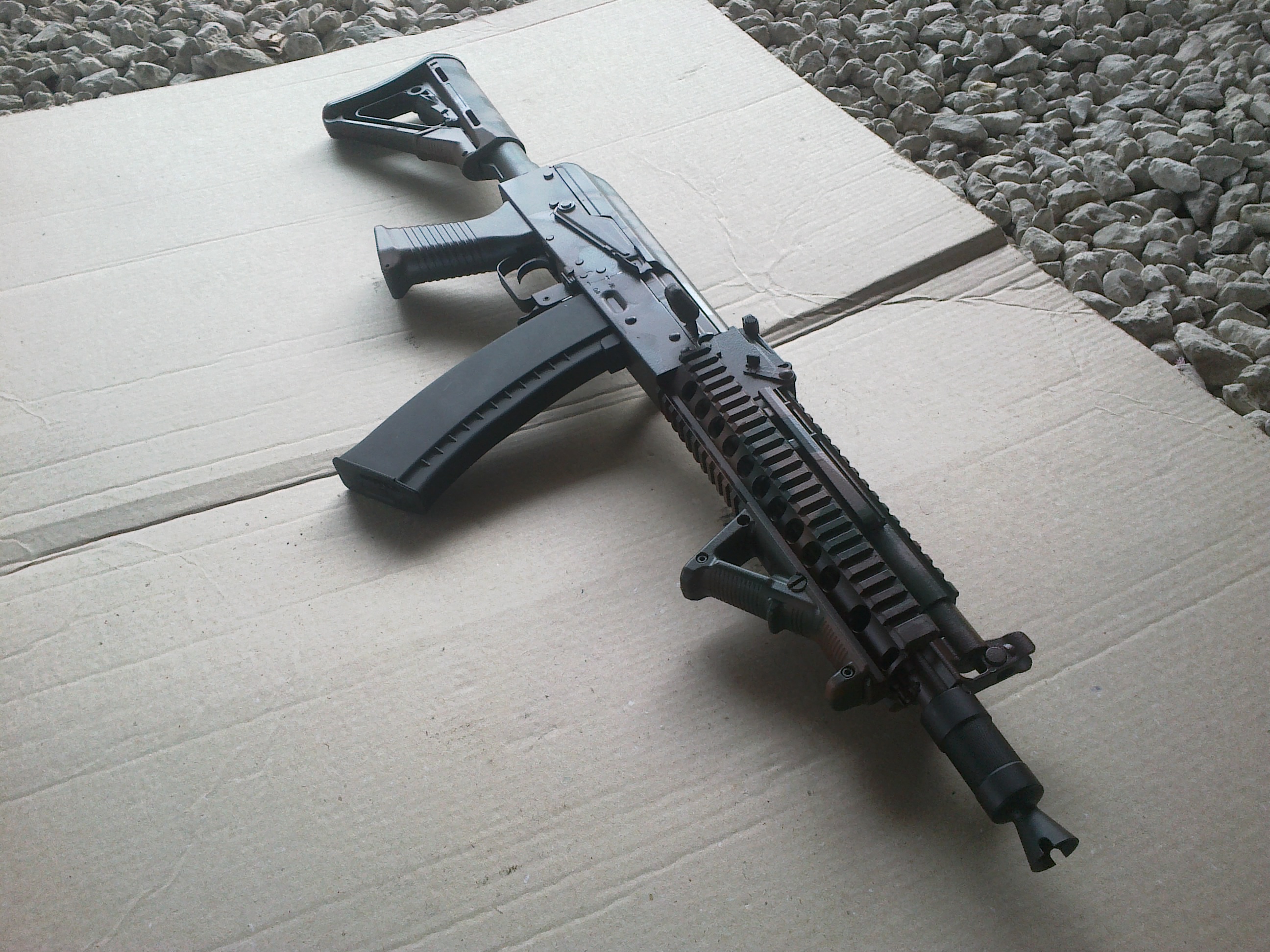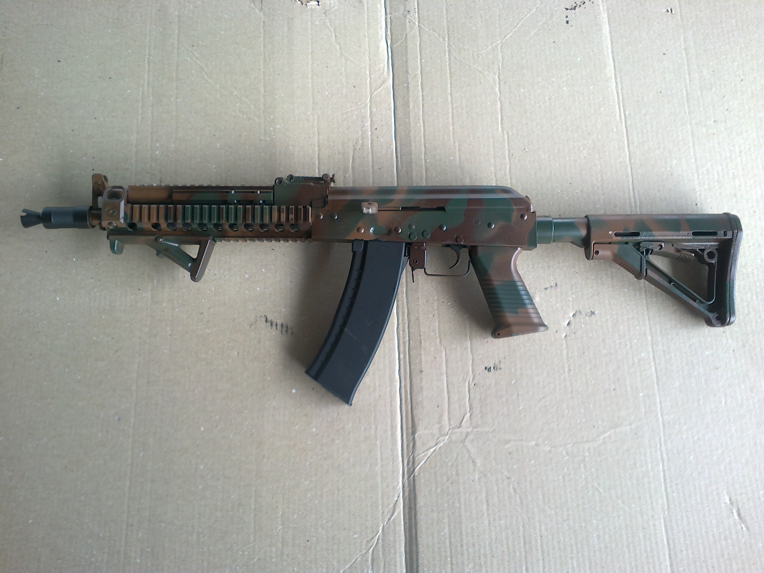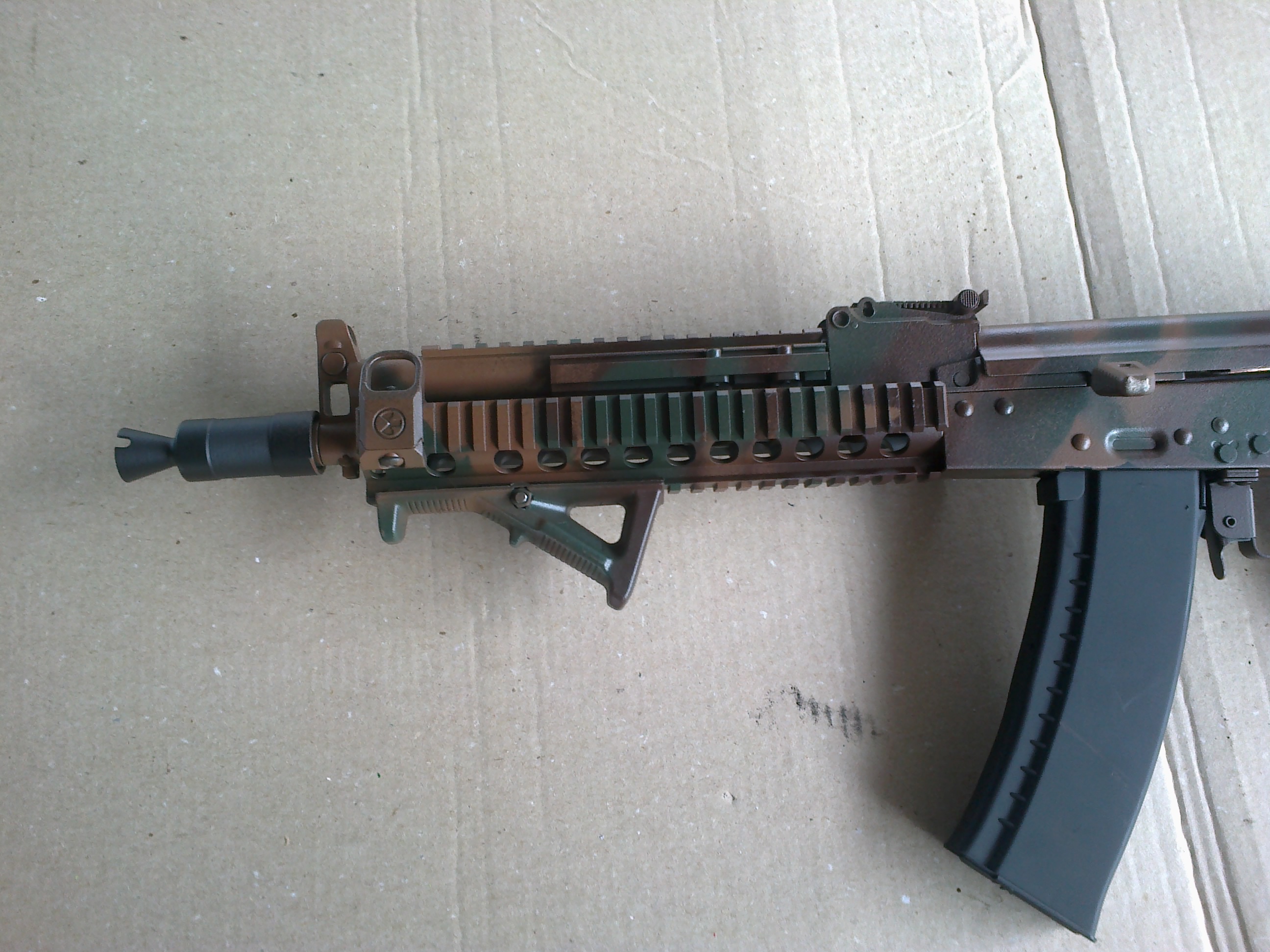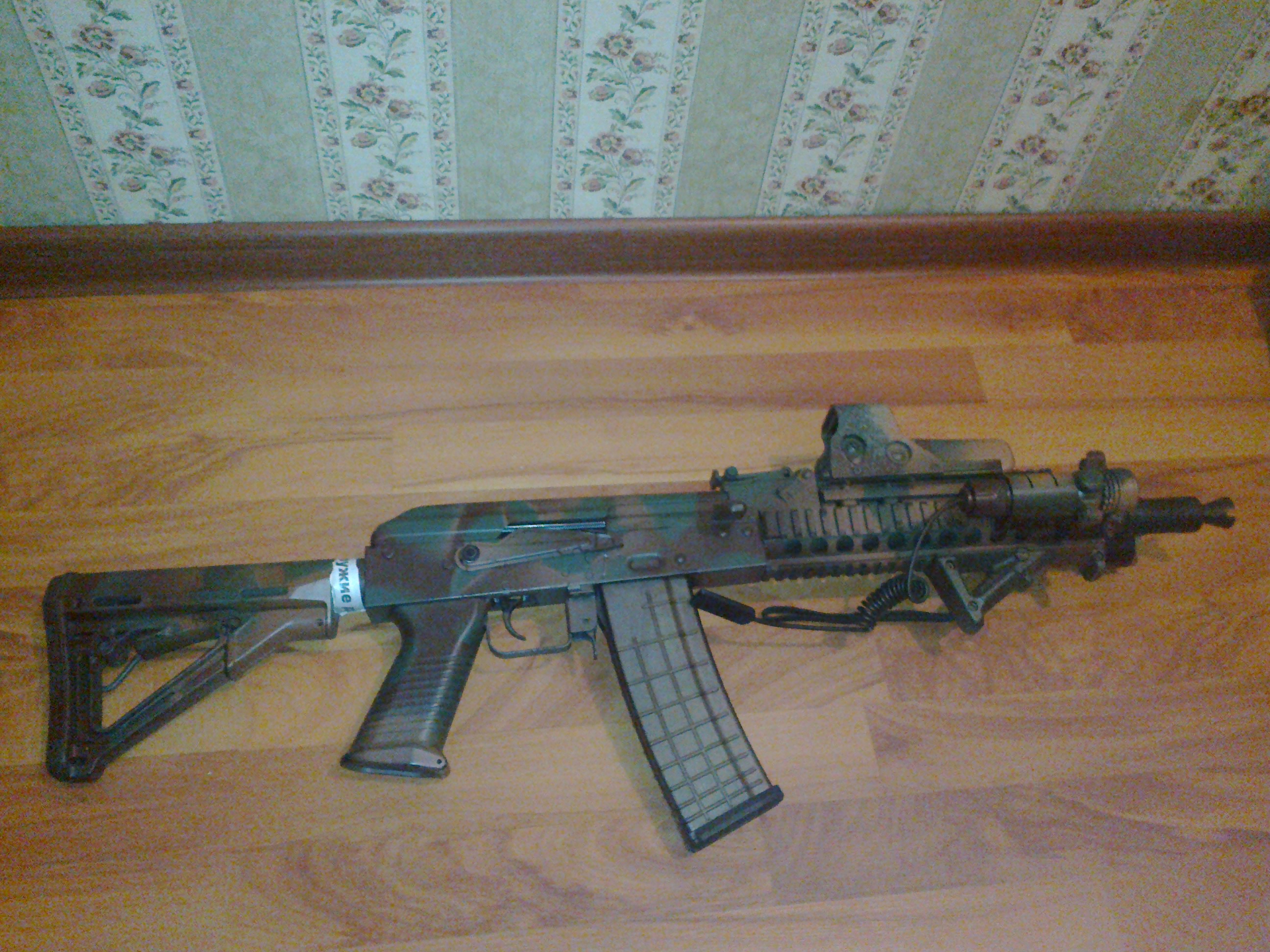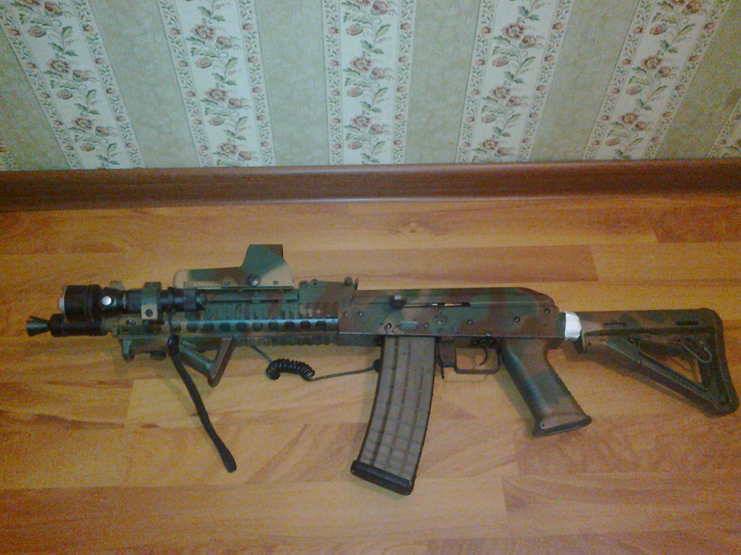 Собсно прикол в том, что это 105 АК, но у него приклад от эмки не складной,очень длинные РИСы на цевье, РИС на газовой трубе, эргономичная пистолетная рукоятка и 2 рукоятки затвора (справа и слева), рукоятки доработанне и очень удобные. Хоп металлический.
