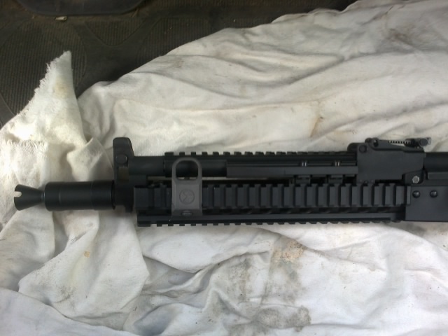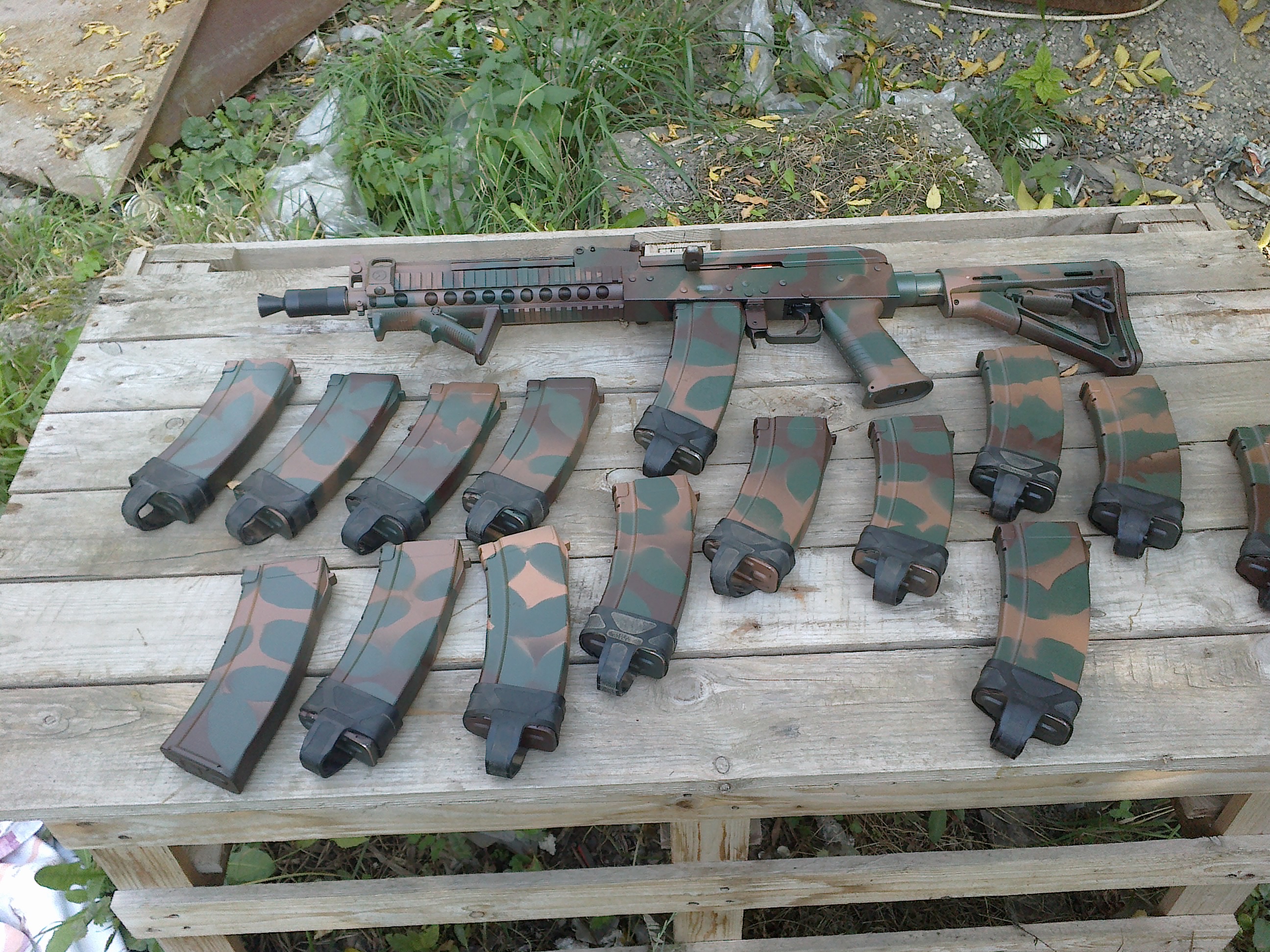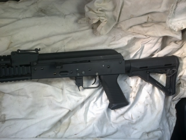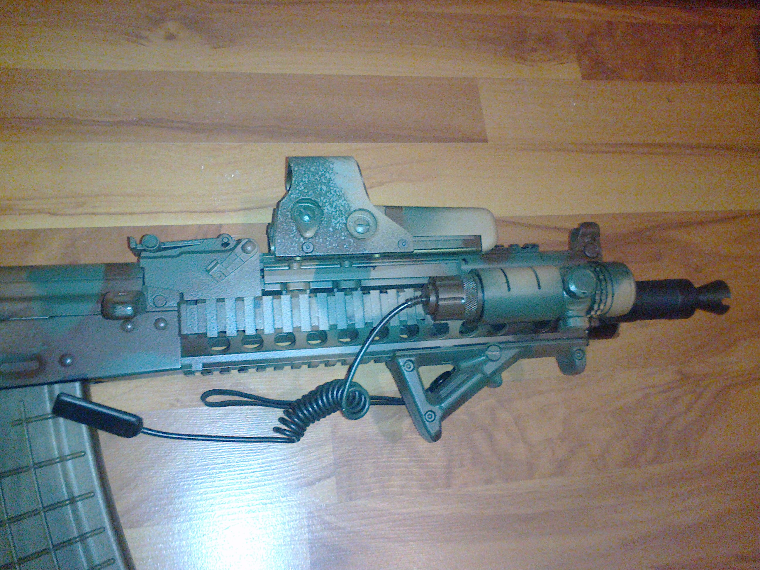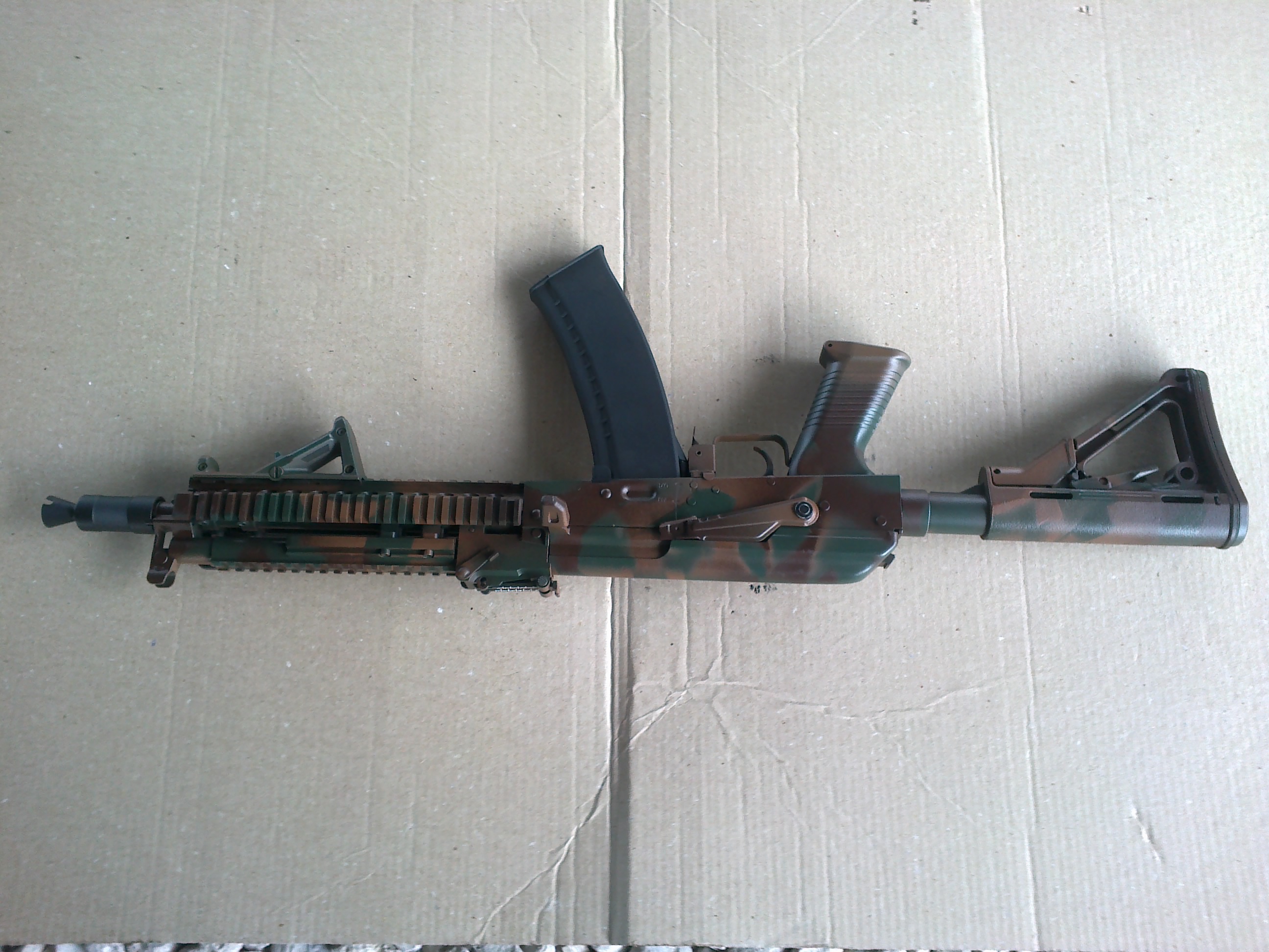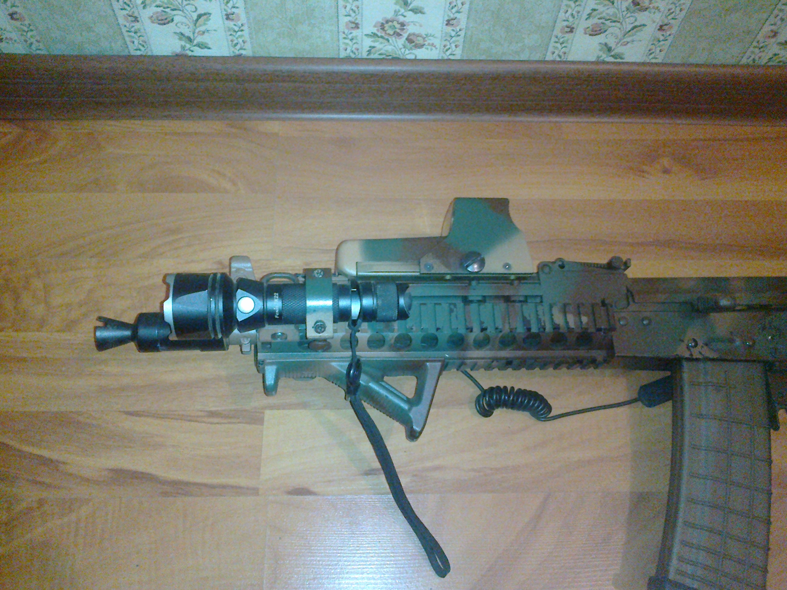 Собсно прикол в том, что это 105 АК, но у него приклад от эмки не складной,очень длинные РИСы на цевье, РИС на газовой трубе, эргономичная пистолетная рукоятка и 2 рукоятки затвора (справа и слева), рукоятки доработанне и очень удобные. Хоп металлический.