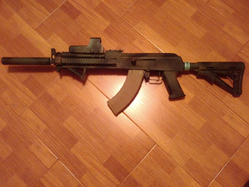 Собсно прикол в том, что это 105 АК, но у него приклад от эмки не складной,очень длинные РИСы на цевье, РИС на газовой трубе, эргономичная пистолетная рукоятка и 2 рукоятки затвора (справа и слева), рукоятки доработанне и очень удобные. Хоп металлический.