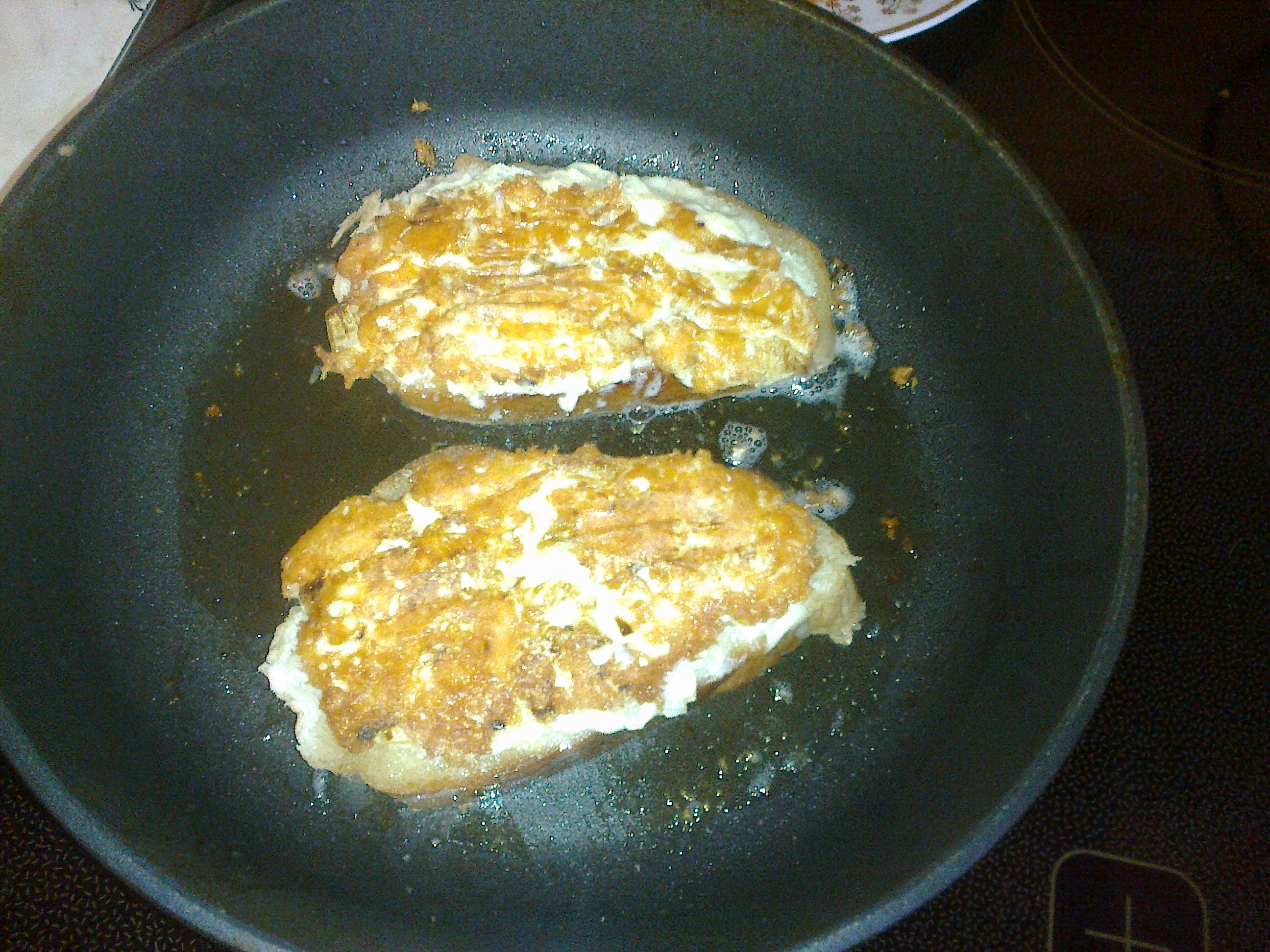 Лук мелко нарезать, сыр натереть на тёрке, яйца разбить - всё перемешать. Консистенция должна быть не слишком густой, но и не жидкой. Смесь намазывается на белый хлеб и жарится на сковороде на подсолнечном масле, причём сначала со стороны начинки, потом с другой. Жарить со стороны начинки нужно до получения золотистой корочки, осторожно переворачивая лопаткой.