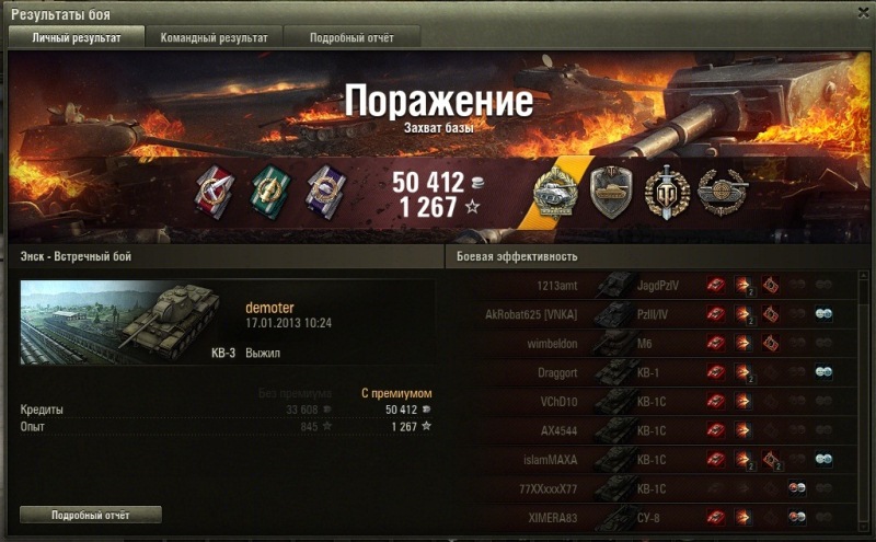 Исключительно мои матюки, что три 100% живых кваса ссут подойти к флагу, где стояли три вражеских танка, чтобы сбить захват. А я медленно к нему полз, разнося по пути всё и вся. уже подойдя к флагу на 80 процентах захвата успел завалить кв-1, но банально не успел завернуть за угол, где стоял ИС, т.к. у меня мех-вод контужен был.Варяг писал(а):Сань, а что было в чате?