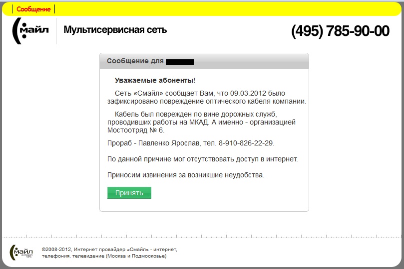 Во дают, первый раз такое у моего провайдера.... В смысле первый раз объясняют и извиняются перед всеми абонентами. Сообщение выскакивает при первом подключении к инету после восстановления работоспособности.
