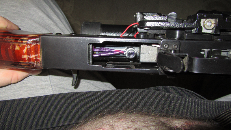 далее вывел проводочки с батарейки, которая подсвечивает сетку на оптике, заменил обычную батарейку на акум 3,7 вольта
