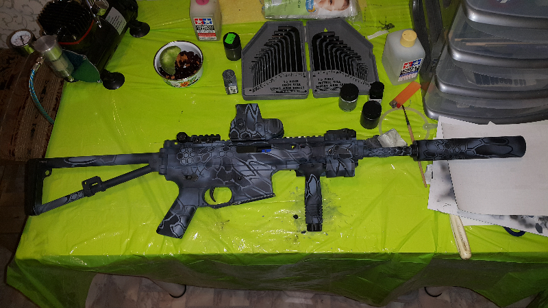 вечером если сфоткаю, то скину, не забыть бы, а так обыкновенный лак, купленный автомагазине, который был первый попавшийся. Но стираться всё равно будет со временем. Особенно в местах, где карабин ремня будет елозить и пр и тд
